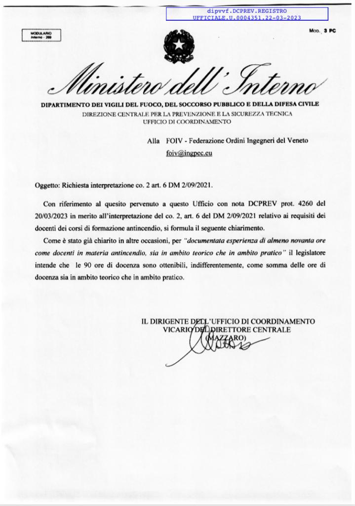 Chiarimento interpretativo art. 6 comma 2 DM 02/09/2021 Ministero dell’Interno del 22/03/2023 – per documentata esperienza di almeno 90 ore come docenti in materia antincendio, sia in ambito teorico che in ambito pratico, il legislatore intende che le 90 ore di docenza sono ottenibili, indifferentemente, come somma delle ore di docenza sia in ambito teorico che in ambito pratico